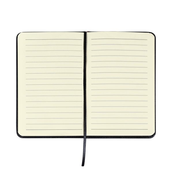 Caderneta emborrachada com marcador de página em cetim e fita elástica para fechar. Contém aproximadamente 80 folhas amareladas com pauta.