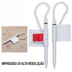 Caneta balcão plástica com suporte e adesivo auto colante. Carga esferográfica azul.