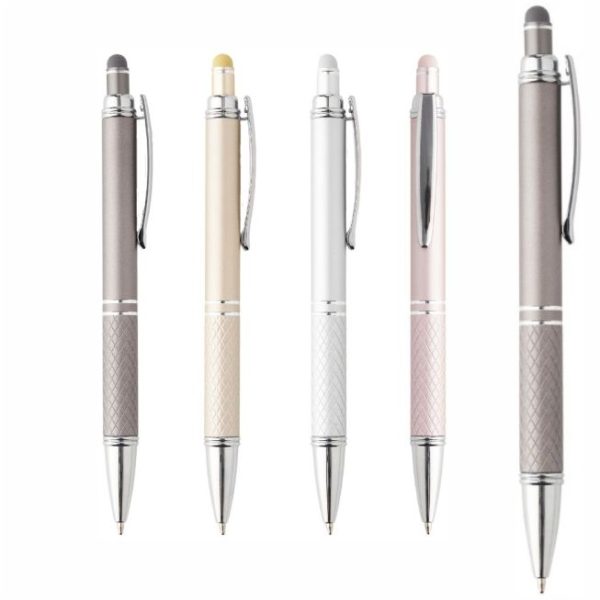 Caneta metálica touchscreen com parte inferior texturizada, acionamento por clique e carga esferográfica azul 1.0mm.