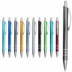 Caneta metálica com design quadrangular, acabamento brilhante (exceto a prata) e detalhe emborrachado, carga esferográfica azul e acionamento por clique.