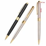 Caneta metálica com carga esferográfica azul e acionamento por rotação.