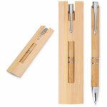 Descrição: Nosso Kit Ecológico de Caneta e Lapiseira de Bambu é excelente para quem busca um toque sustentável no dia a dia. A lapiseira possui acionamento por clique, e a caneta conta com carga esferográfica azul de 1.0mm e função touch para quem precisa de toques precisos em dispositivos. Além disso, acompanha uma embalagem que imita bambu. Uma ótima escolha para presentes corporativos ou para quem ama escrever sem abrir mão da consciência ecológica!
