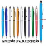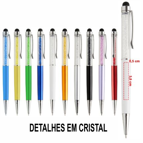 Caneta plástica com touch screen e detalhes em cristal, acionamento por rotação e carga esferográfica azul 1mm.
