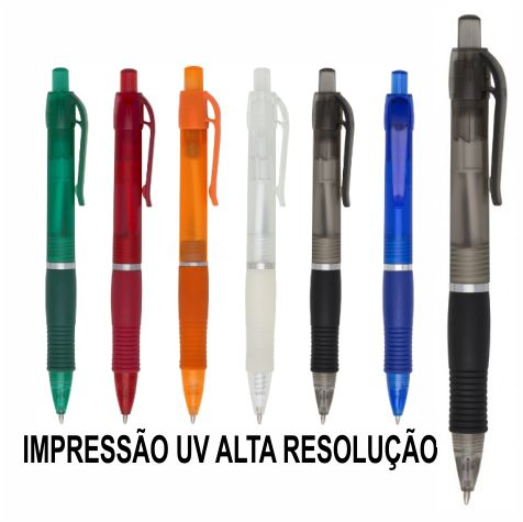 Caneta plástica com detalhe emborrachado, carga esferográfica azul e acionamento por clique.