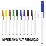 Caneta plástica com carga esferográfica azul e acionamento por clique.