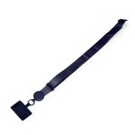 Cordão com alça ajustável para celular feito em poliéster. O acessório é fixado a um cartão retangular que se encaixa na parte interna da capa do celular, próximo à entrada de carregamento USB.