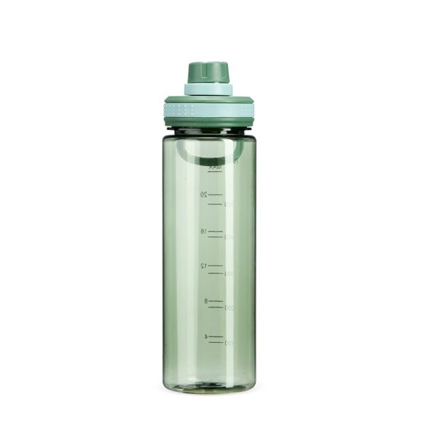 Garrafa plástica com capacidade máxima de 750ml e marcação impressa de volume de até 700ml. Possui tampa rosqueável com protetor para o bocal e alça para transporte.