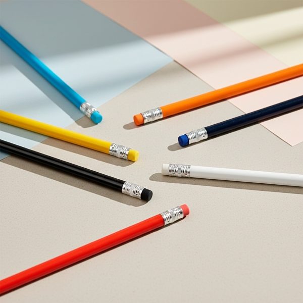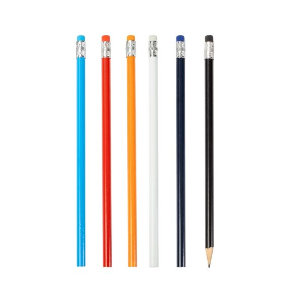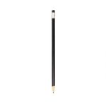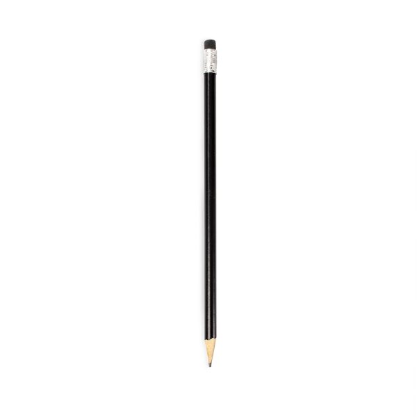 Lápis sem ponta feito em madeira com grafite preto HB, guarnição em metal e borracha na extremidade oposta.