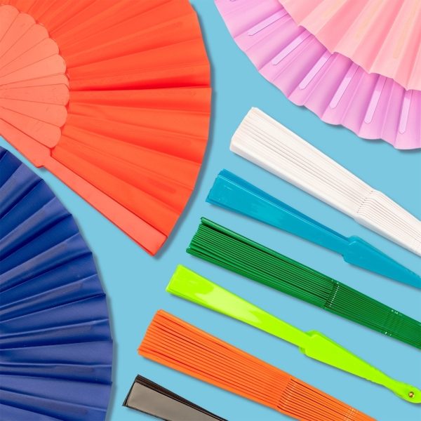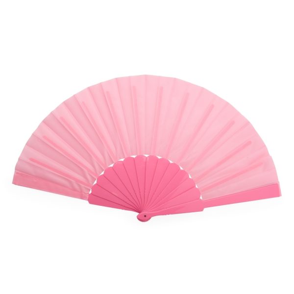Leque com estrutura plástica compacta e tecido leve.