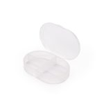 Porta-comprimidos feito em plástico. Possui compartimento removível com quatro divisórias, o que facilita a limpeza e ajuda a organizar medicamentos ou pequenos objetos.