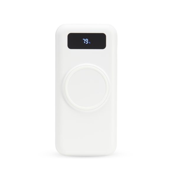 Carregador portátil power bank com 10.000mAh e carregamento via indução ou via cabo. Com display digital indicador de bateria, o carregador contém quatro cabos acoplados: Lightning, Tipo-C, V8 e saída USB para o carregamento da própria bateria. Portas de entrada: V8, Tipo-C e duas portas USB.
