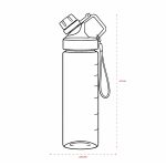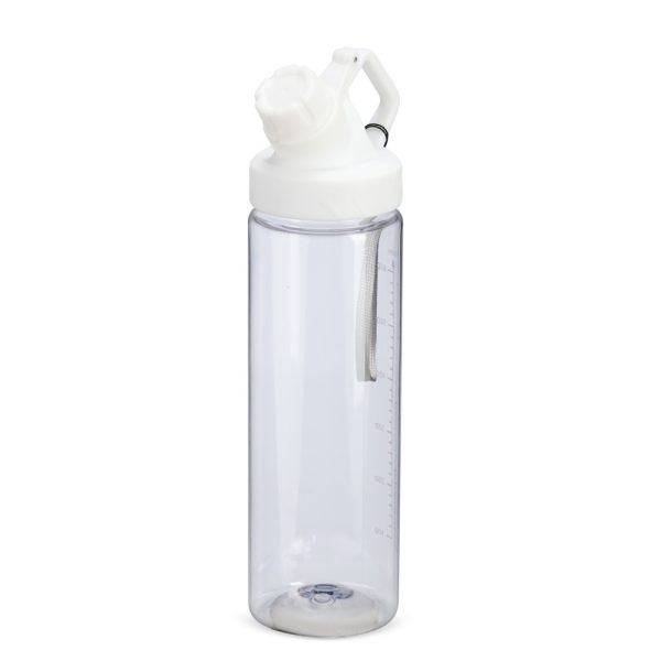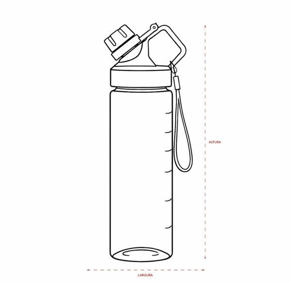 Squeeze plástico livre de BPA, com capacidade máxima de 750ml e marcação de volume de 700ml impressa no corpo. Dispõe de bocal plástico com protetor rosqueável para o bocal e alça fixa. Acompanha cordão de nylon para prender à alça da tampa.